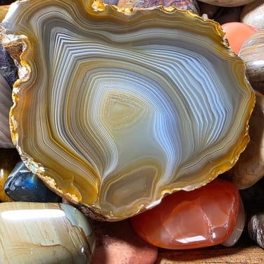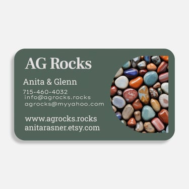 Then Glenn caught the bug!!! He bought me a 12 lbs. tumbler, another single barrel tumbler for polish only, then a 10-inch trim saw from Hi-Tech Diamond and then we got a Cabbing Machine from Kingsley North and a flat lap machine, then a Hi-Tech Diamond 5-inch trim saw needless to say, we are now a small business. We made a few trips to Lake Superior, Lake Michigan, a few local spots and a secret location locally (thanks Linda!) and started to really pick up rocks and stones. We also made several purchases from other rock, mineral, and gem shops to get us amped up. We did a couple of fair-sized craft shows and did well. That was more than enough for Glenn to decide "ok, this is what we are going to do in our retirement." Bless his heart-I work as much or more now than I did while I was employed outside the home and so does he! He purchased a 16-inch slab saw from Highland Park Lapidary and we have been slabbing away! What you see in our website shop is our beginning on-line business, as well as our newer Etsy page (anitarasner). We hope that with your support we can continue to grow and fulfil all our (yours and ours) rock dreams!